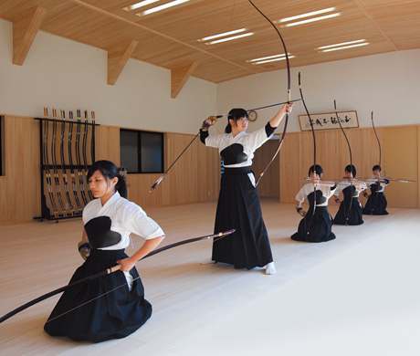 平安時代のころより、神事に弓矢が取り入れられ、流鏑馬(やぶさめ)、歩射(ぶしゃ)神事、蟇目(ひきめ)神事など様々な形式をとり、作物の豊凶や人々の幸福・健康・出世などの祈願に使われ、現代に受け継がれています。江戸時代に入ると、人間の人格形成や心身鍛練のひとつの「道(武道)」として「弓道」が確立され、全国各地に弓道場が建てられました。