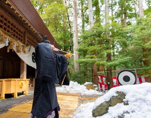 厄年の方が集い、一年の平穏を祈願する祭典です。天地人四方八方と災禍を祓い清める"獅子神御祈祷神事"と、一年間の邪氣を祓う「大的弓の神事(外拝殿前)」が行われます。