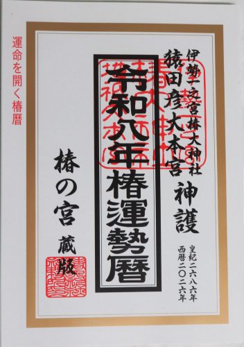 授与品 令和8年椿運勢暦頒布開始 2025.10.17 人生の指針ともなるべき暦(運命を開く椿暦)を今年も謹製、発行いたします。 令和8年椿運勢暦 初穂料1、100円 ご連絡いただければ発送もいたします。 連絡先:椿大神社社務所 電話 059-371-1515 FAX 059-371-1668